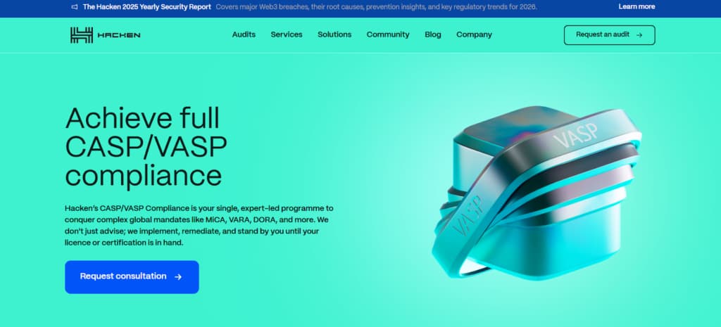 Hacken’s CASP/VASP Compliance handles MiCA, VARA, DORA, BMA, and similar regulations through one program. They do the implementation work, address gaps, and continue support until the license or certification is granted.